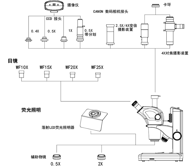 辅助物镜0.5X工作距离165mm/2XCCD接头0.4X/0.5X/1X/0.5X带分划摄像仪DV-130 / 300 / 500 / 1000 (130-1000万像素,带USB接口)数码相机接头CANON(EF)/NIKON(F)