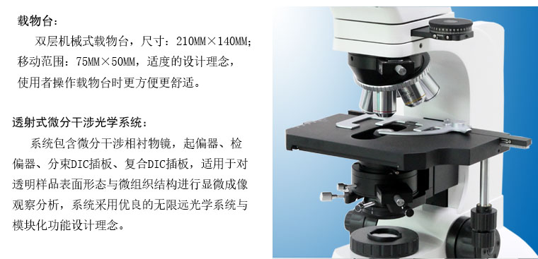 透射式微分干涉相衬聚镜,设置专用微分干涉棱镜组插槽,内置可变孔径光阑,部件采用定位安装模式,可快速装卸而不影响定位精度,部件可整体上下升降,可附加滤光片