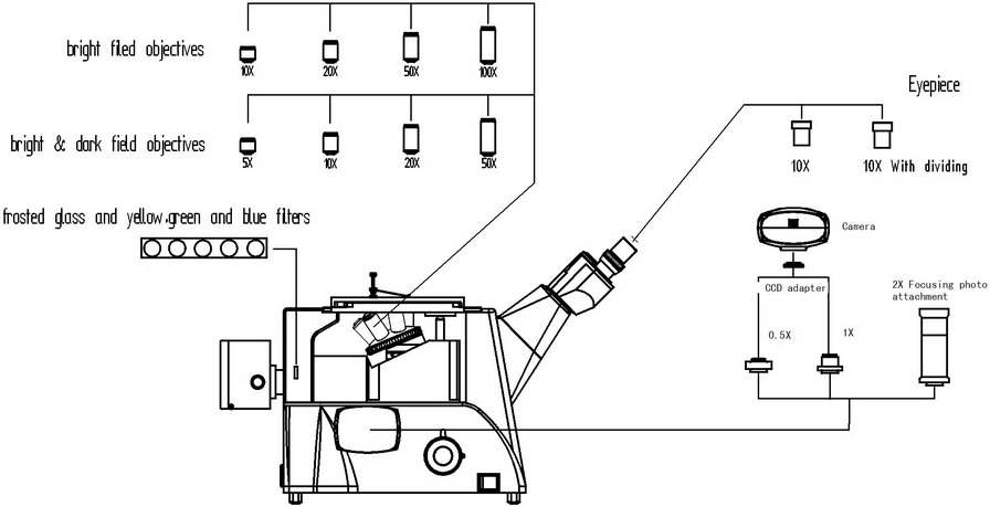 NameSort/Technique parameterNO.EyepieceDividing eyepiece(Φ22mm)ObjectivePL L5X/0.12 (Work distance):26.1 mmEquipped with bright field objectivesPL L40X/0.60 (Work distance):3.98 mmPL L60X/0.75 (Work distance):2.03mmPL L80X/0.80 (Work distance):1.25 mmPL L40X/0.60 BD (Work distance):3.00 mmEquipped with bright & dark field objectivesPL L60X/0.7 BD (Work distance):1.65mmPL L80X/0.80 BD (Work distance):0.80mmPL L100X/0.85 BD (Work distance):0.4 mmCCD Adapter0.5X1X0.5X with dividing 0.1mm/DivCameraDV-1 Video output 380/520 TV line USB output 0.42 M pixelDV-2 With USB output 1.3M,2.0M,3.0M pixelDV-3 With video output 380/520 TV lineDigital camera adapterCANON(EF) NIKON( F)